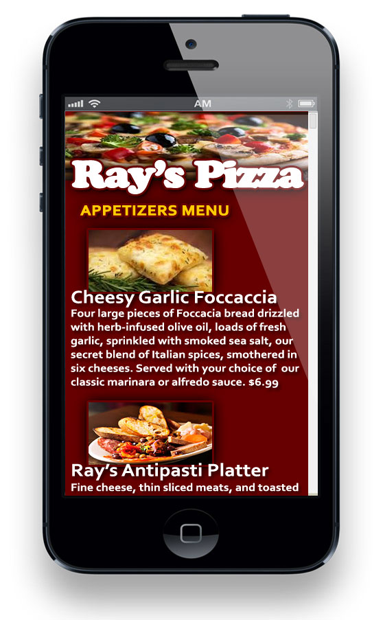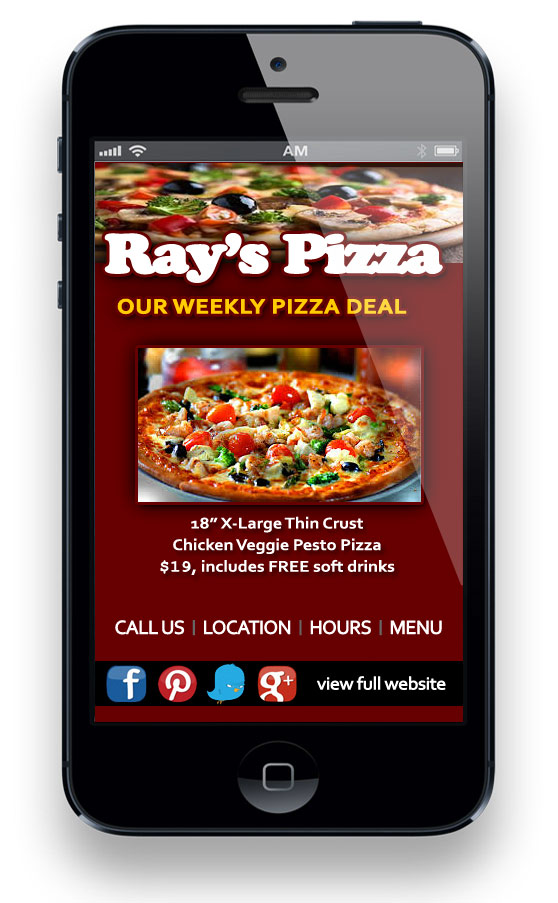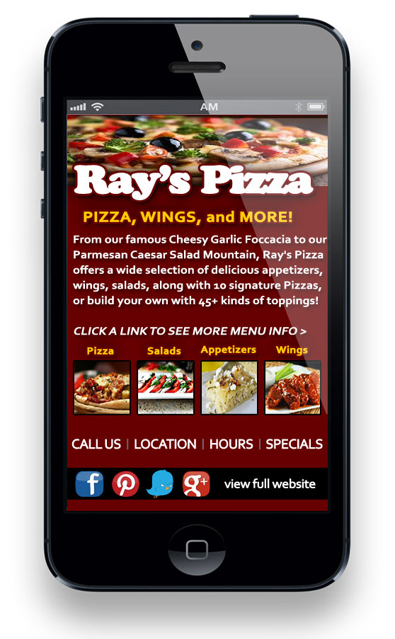 Just as an example of how your restaurant’s new great mobile website might look, I’ve created a mobile website for my restaurant. — I’ve always wanted to own a pizza brewpub. — This mobile website for Ray’s Pizza, like your site should, features an easy-to-navigate design and provides quality content that will get people into my restaurant.